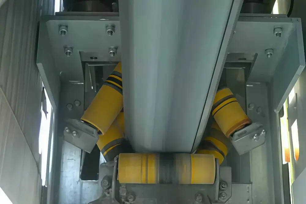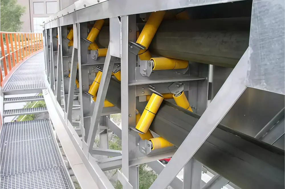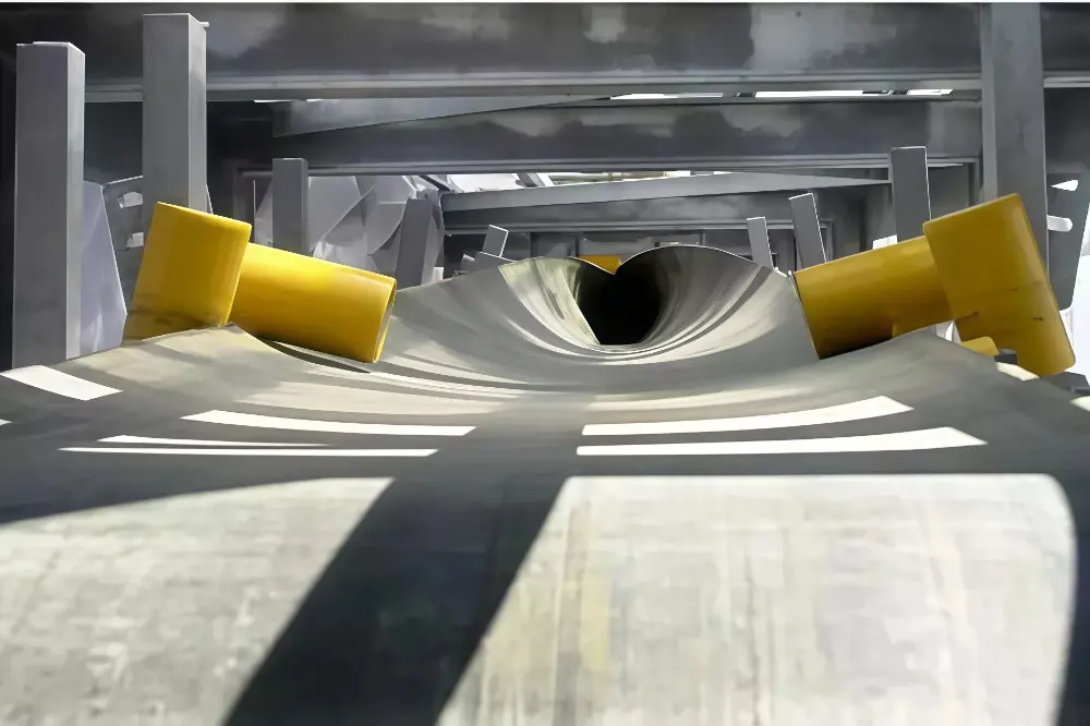 密闭输送段:进入正式管状段,输送带被六边形(或四边形、八边形)布置的托辊组完全卷成圆形管状,将物料密闭其中。